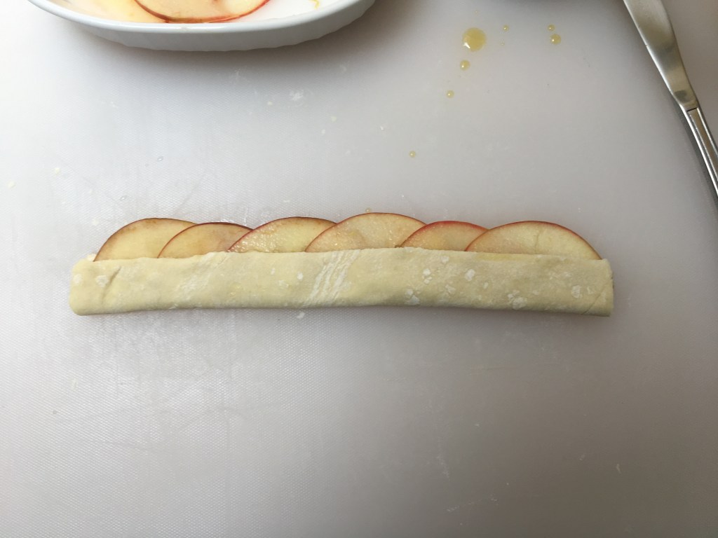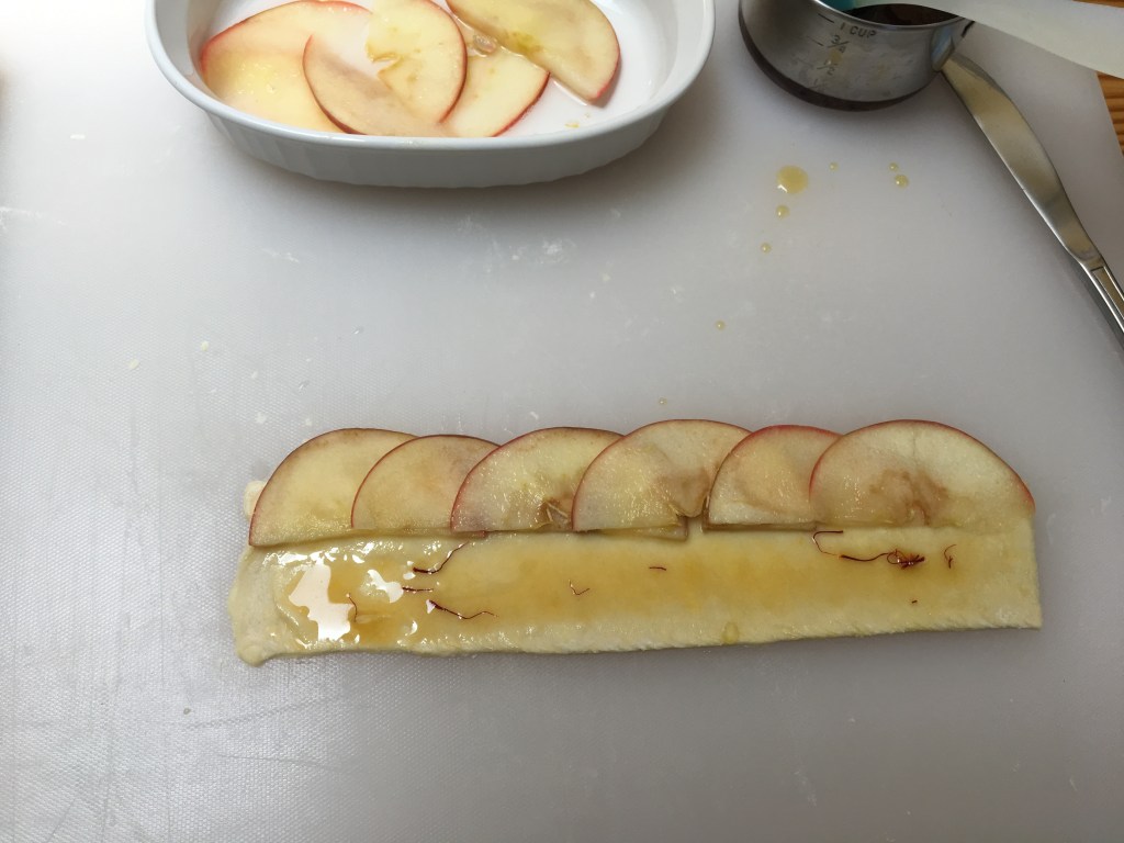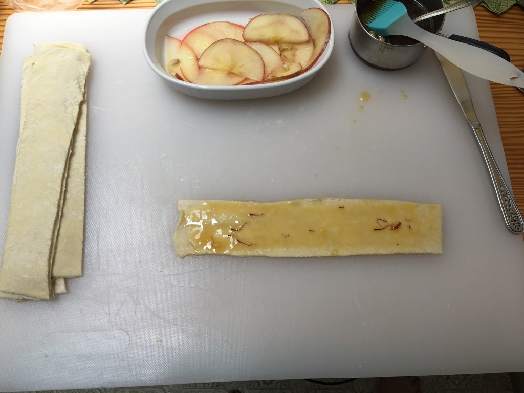 - Brush the lemon saffron honey onto the puff pastry strip. Layer the apple slices on the top half of the pastry, letting the skin side hang over the top of the pastry and overlapping slices. Fold up the bottom half of the pastry. Roll the pastry up from one end. Repeat with all 6 strips. (See photos!)